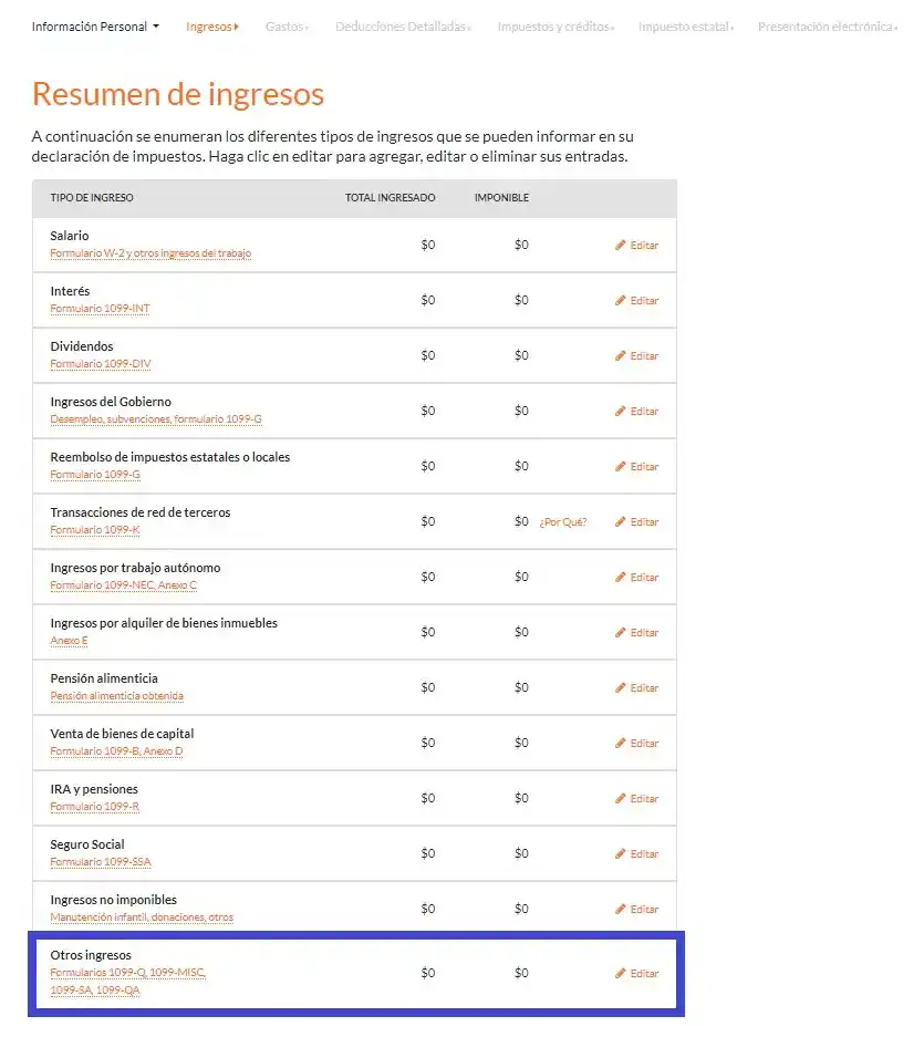 Seleccione "Editar" junto a "Cualquier otro ingreso imponible".