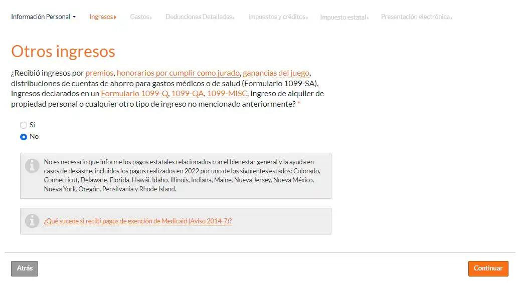 Esto lo llevará a la página de "Otros Ingresos".