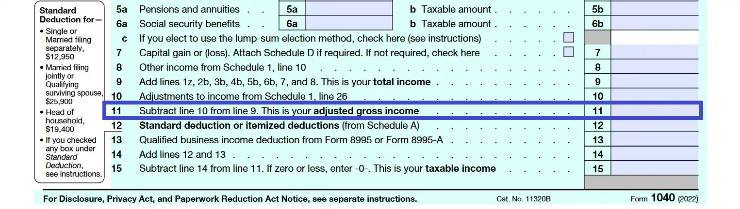Para localizar tu AGI del año anterior, necesitarás una copia de la declaración de impuestos del año pasado. Tu AGI del año anterior se encuentra en la línea 11 de tu Formulario 1040 o 1040-SR del año 2024.