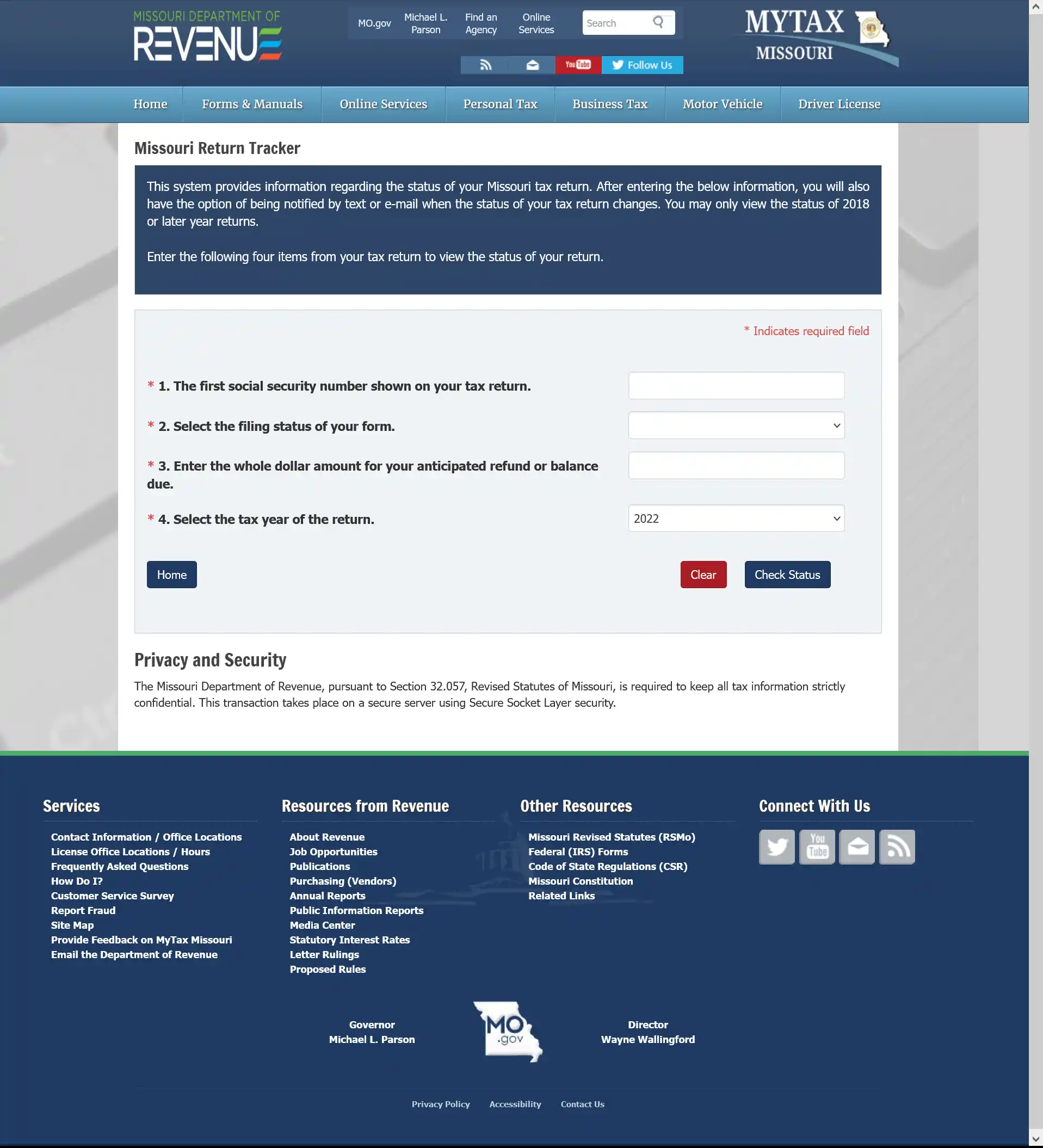 You can check the status of your Missouri tax refund by visiting https://dor.mo.gov/taxation/return-status/